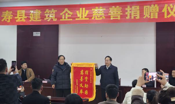 儀式上,壽縣建筑企業(yè)向壽縣困難群體捐款 138000 元,會(huì)長(zhǎng)顧元幸代表愛心企業(yè)接受了縣民政局贈(zèng)送的錦旗。