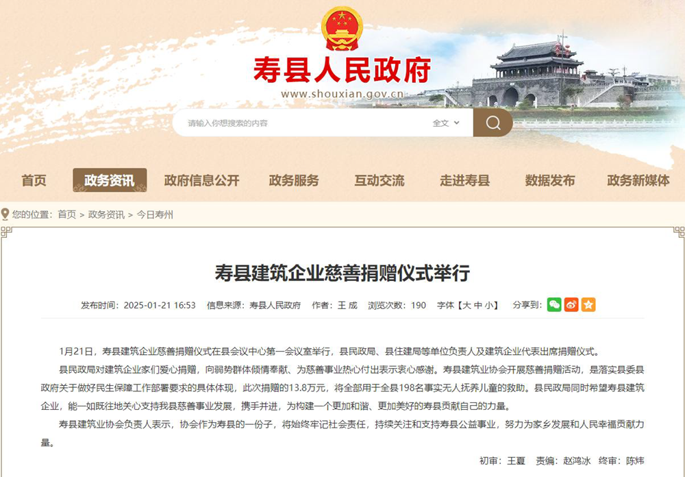1 月 21 日,壽縣建筑企業(yè)慈善捐贈(zèng)儀式在壽縣會(huì)議中心第一會(huì)議室隆重舉行。此次活動(dòng)得到了縣民政局、縣住建局等單位的大力支持,相關(guān)負(fù)責(zé)人以及眾多建筑企業(yè)代表齊聚一堂,共同見證了這一愛心時(shí)刻。